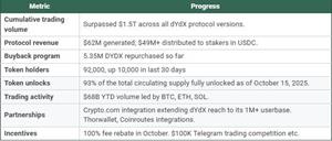 The dYdX Chain continues to reinforce its leadership in decentralized derivatives, surpassing $1.52 trillion in lifetime trading volume across all protocol versions. Since the launch of the chain, the protocol has generated over $62 million in cumulative fees, with almost $50 million rewards distributed to stakers in USDC. In the past 30 days, the number of new token holders has also grown by about 10,000, bringing the total number of DYDX holders to over 92,000.